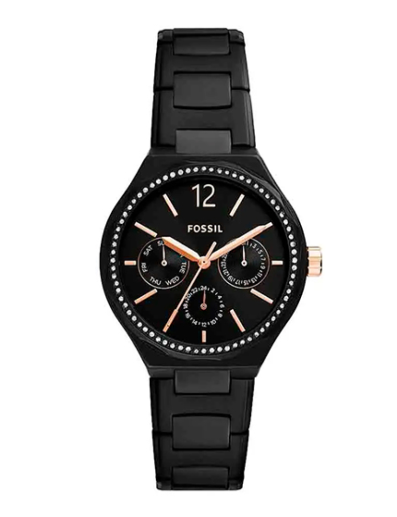 Reloj Fossil BQ2645 evanston para dama, tamaño de la caja 45 mm de acero inoxidable y piedras, pulso de acero inoxidable, color negro, resistencia al agua hasta 50 metros