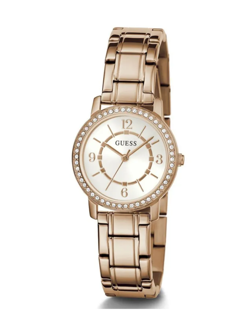 Reloj Guess GW0468L3 Melody para dama, tamaño de la caja 28 mm de acero inoxidable, pulso de acero inoxidable, color oro rosa, cristal mineral, resistencia al agua hasta 30 metros.