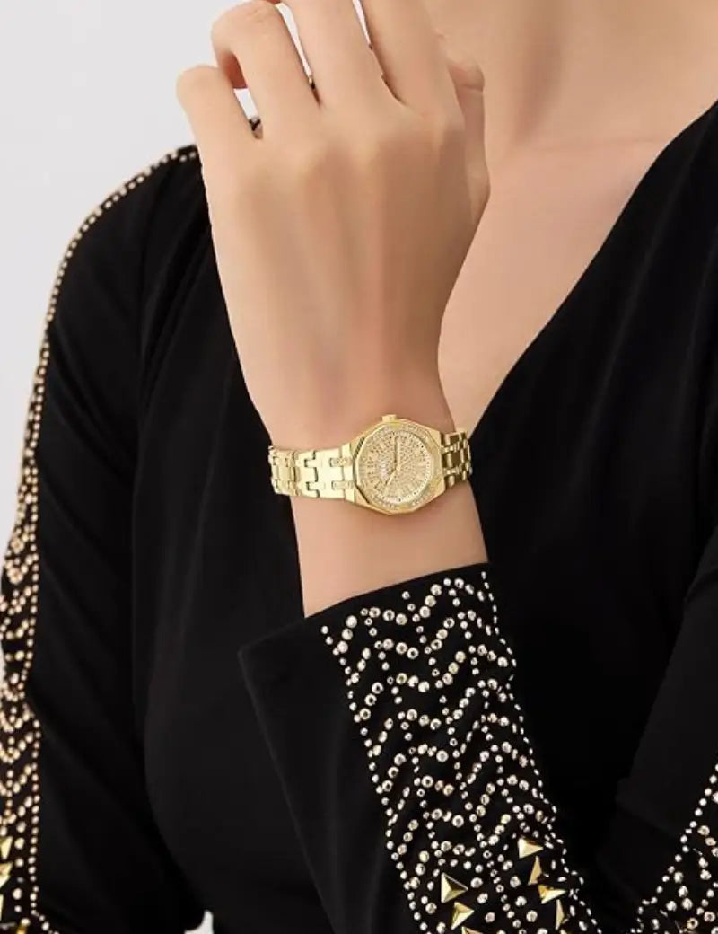 Diámetro: aprox. 0.984 in (sin corona), bisel dorado con piedras blancas, altura aprox. 0.313 in