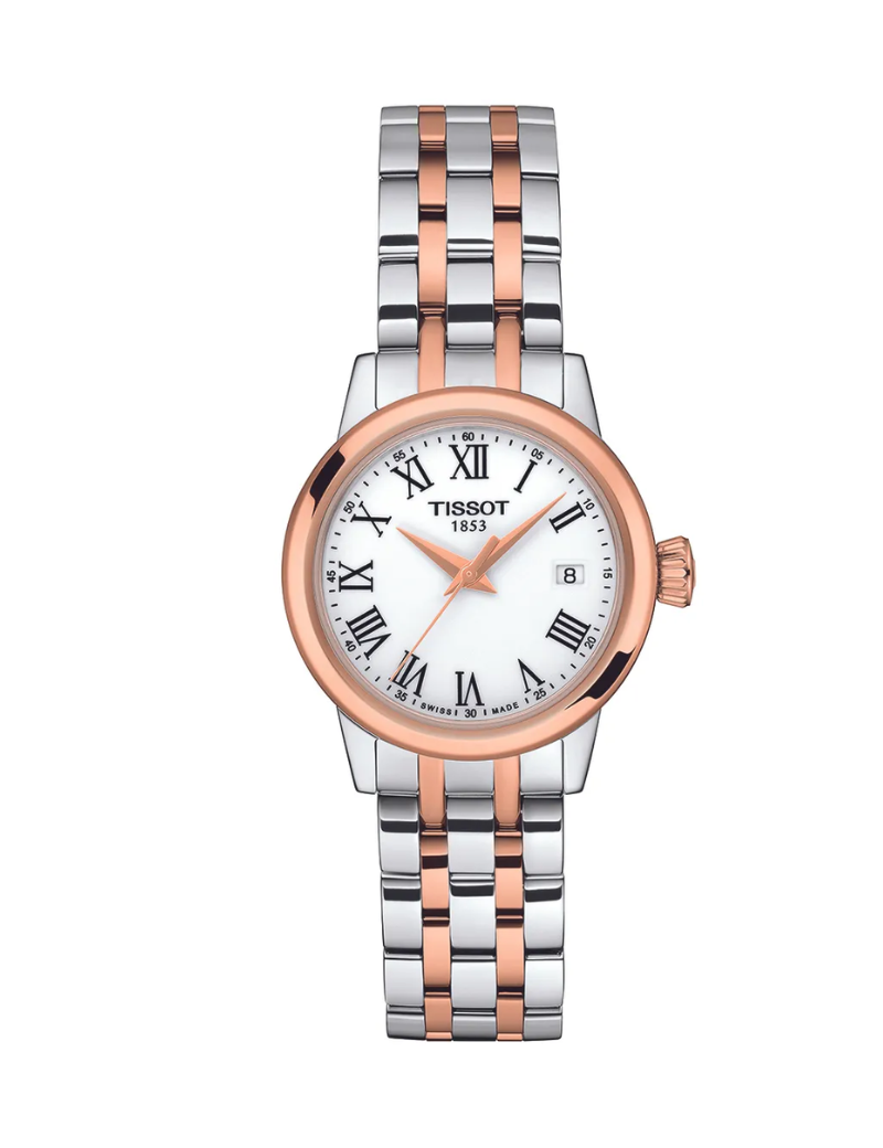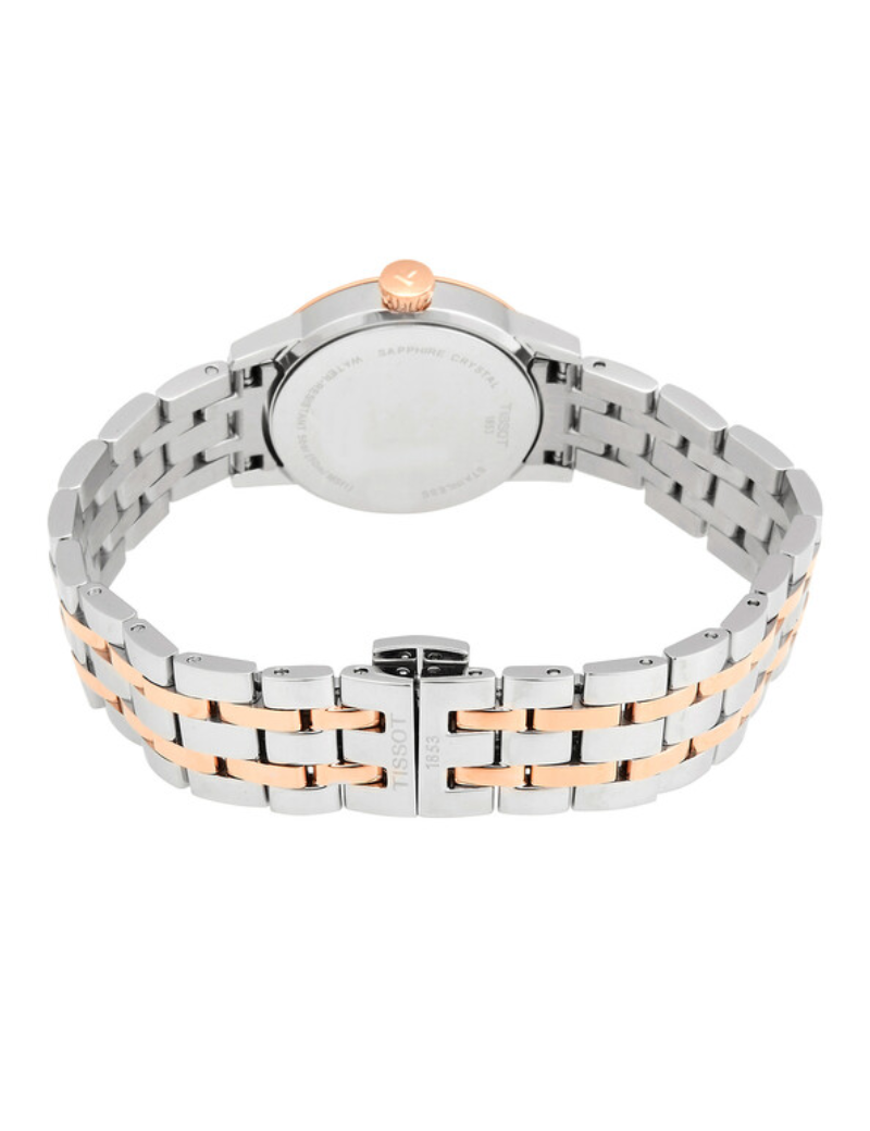 Reloj Tissot T129.210.22.013.00 classic dream lady para dama, tamaño de la caja 28 mm de acero inoxidable, pulso de acero inoxidable / broche mariposa, color plateado-oro rosa, cristal zafiro, resistencia al agua hasta 50 metros.