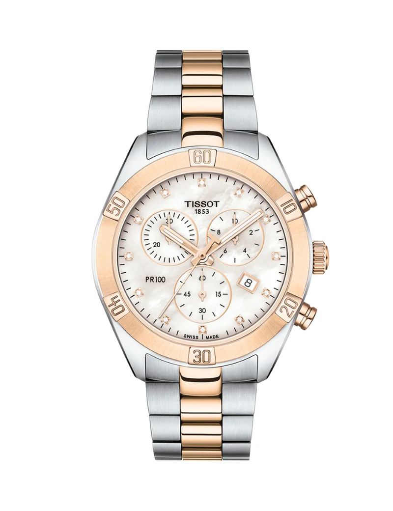 Reloj Tissot T101.917.22.116.00 PR 100 SPORT para dama, tamaño de la caja 38 mm de acero inoxidable marcadores diamantes, pulso de acero inoxidable / broche despliegue con pulsadores, color plateado/dorado, cristal zafiro, resistencia al agua hasta 100 metros.