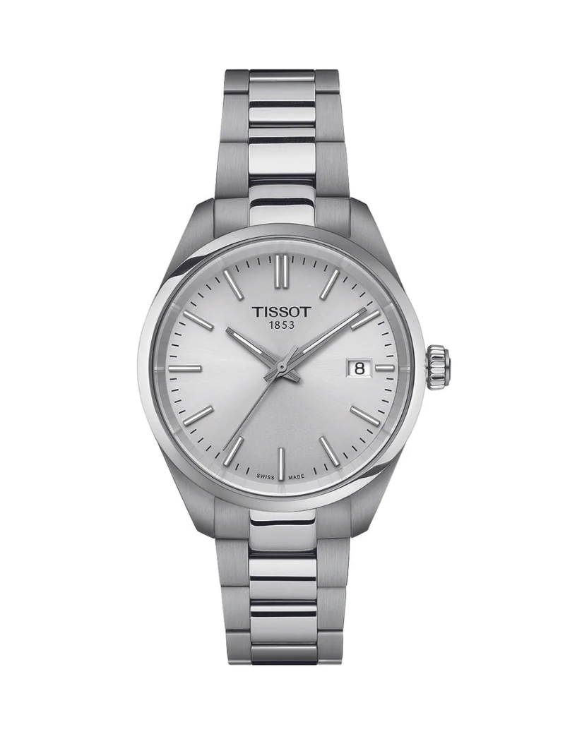 Reloj Tissot T150.210.11.031.00 PR 100 para dama, tamaño de la caja 34 mm de acero inoxidable, pulso de acero inoxidable / broche despegable, color plateado, cristal zafiro, resistencia al agua hasta 100 metros.