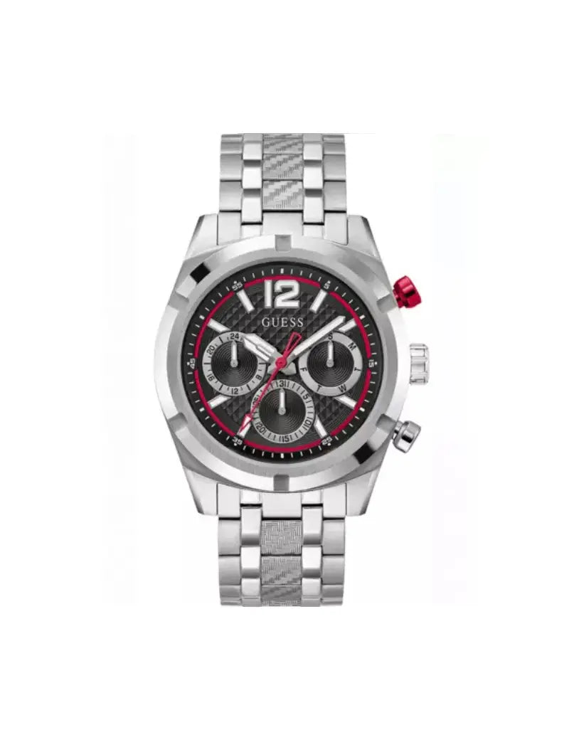 Reloj clásico de acero inoxidable en tono plateado con detalle de logotipo en la esfera.