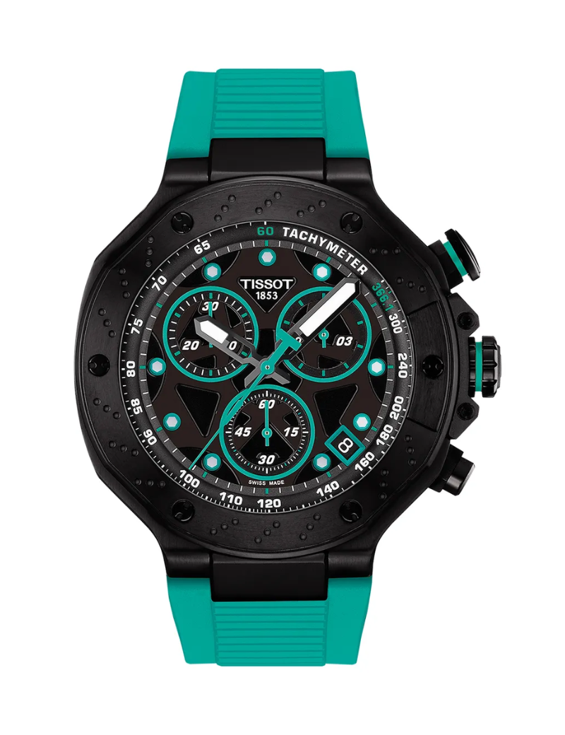 Reloj Tissot T141.417.37.051.00 T-Race para hombre, tamaño de la caja 45 mm de acero inoxidable negro, pulso de silicona / hebilla, color verde, cristal zafiro, resistencia al agua hasta 100 metros.